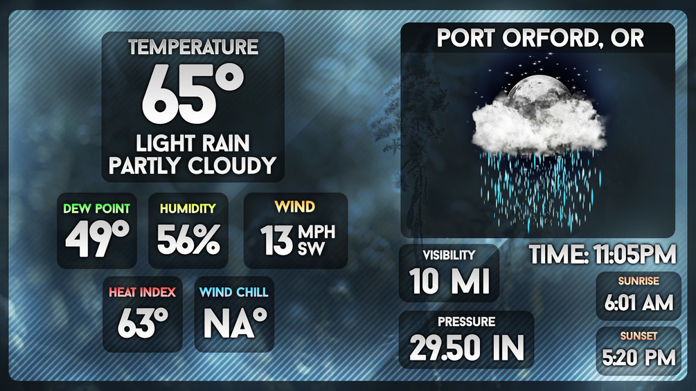 A techy current conditions template with data blocks for temperature & weather conditions, dewpoint, humidity, wind, heat index, wind chill, visibility, pressure, sunrise, sunset, and of course a large space for a weather icon (perhaps WxIcons v3?).