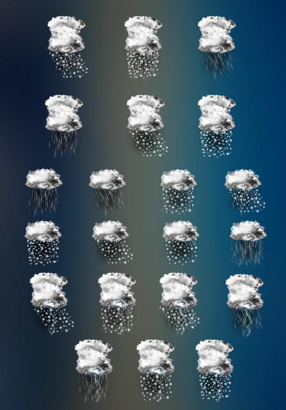 One variation pack includes background shading, which is basically a medium opacity black shade to help bring out the rain & snow particles. The other variation pack doesn't have this black shading. The subset to each of these variations has the sun partially peaking out, in case you don't want solid cloud cover and precipitation.