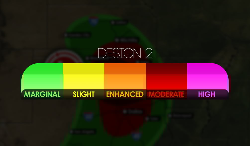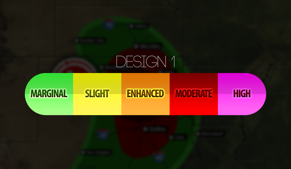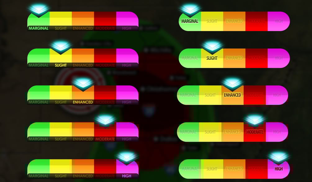 This simple threat bar in two design variations uses the Storm Prediction Center's risk terminology and color scheme, with an easily understandable bright arrow directing attention to the potential current threat.