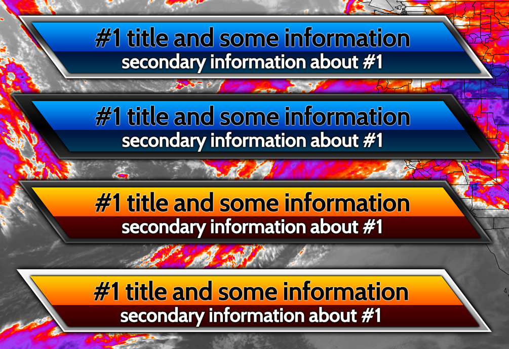 Dark, glossy, high-contrast upper thirds built on a decent sized canvas (2200x360px). Includes a blank PNG and an editable .PSD if you have Photoshop. Includes 4 variations in color (main base colors being orange/red and blue).