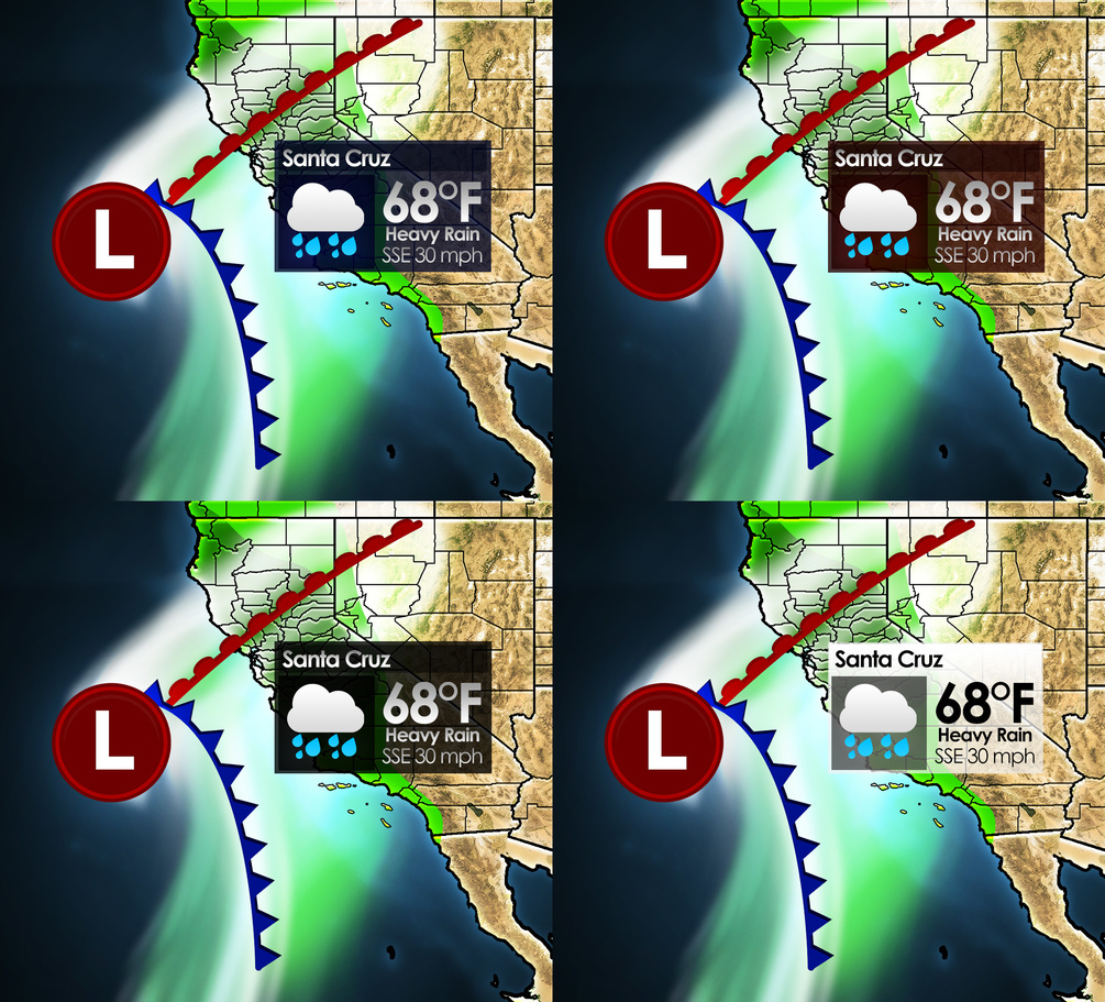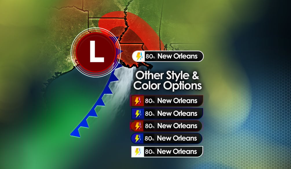 - 2 complete panel designs that include space for a large weather icon, temperature, and space for a description of the weather expected or occurring (totals to 5 panel designs to chose from)